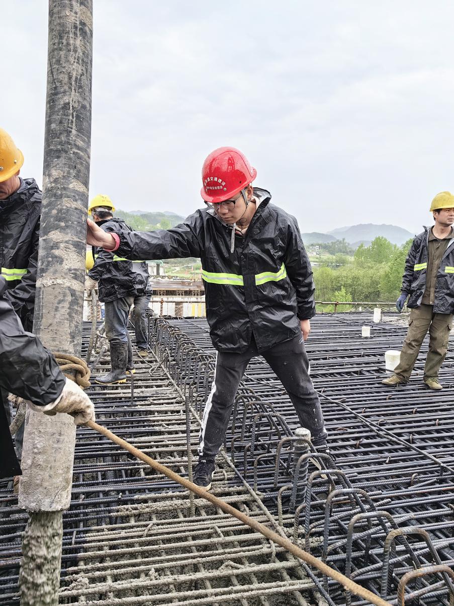 鄖西PPP項(xiàng)目天河口大橋是漢江上最大跨徑的獨(dú)塔預(yù)應(yīng)力混凝土斜拉橋,剛參加工作就能參與大型斜拉橋項(xiàng)目的建設(shè),劉邦感到無比幸運(yùn)也壓力巨大,但他并沒有退縮。針對塔柱截面尺寸變化復(fù)雜,他熬夜摸索預(yù)應(yīng)力槽口分布以及低回縮二次張拉工藝,到現(xiàn)場給工人師傅做安全技術(shù)交底,反復(fù)強(qiáng)調(diào)施工流程,確保順利施工;針對主梁前支點(diǎn)牽索掛籃施工,他虛心請教,堅(jiān)持在現(xiàn)場和工人師傅們一起拉尺復(fù)核預(yù)埋孔和軌道定位,并全過程參與指揮掛籃的下放、行走和提升。原先白凈的書生男孩在施工一線曬得皮膚黝黑,“一線工作雖然辛苦,但這卻是我成長最快、進(jìn)步最大的項(xiàng)目,從聽令行事到自己拿主意解決現(xiàn)場問題,從按時完成工作到主動完成工作,這對我來說意義重大。”劉邦說到。