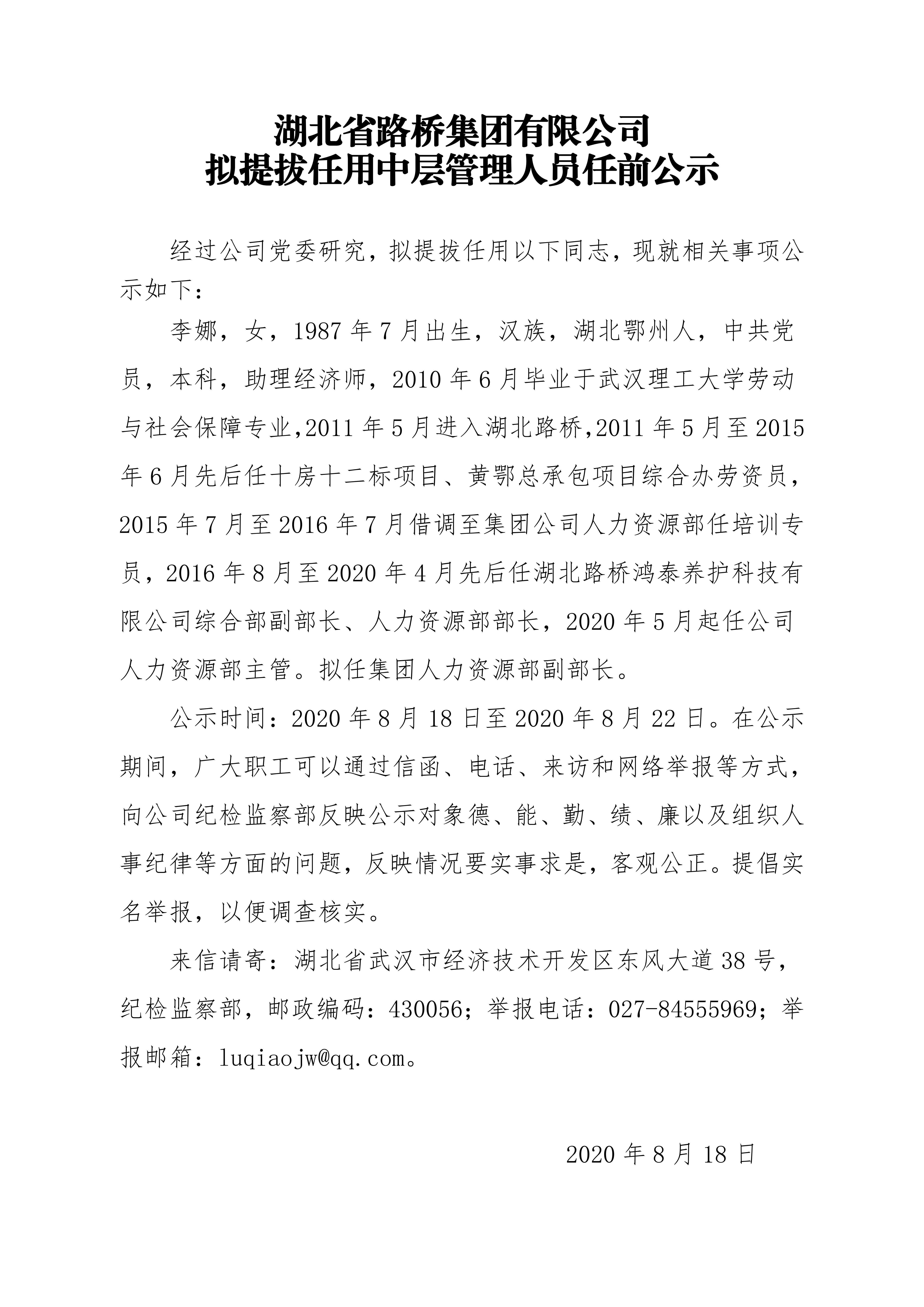 湖北省路橋集團有限公司擬提拔任用中層管理人員任前公示