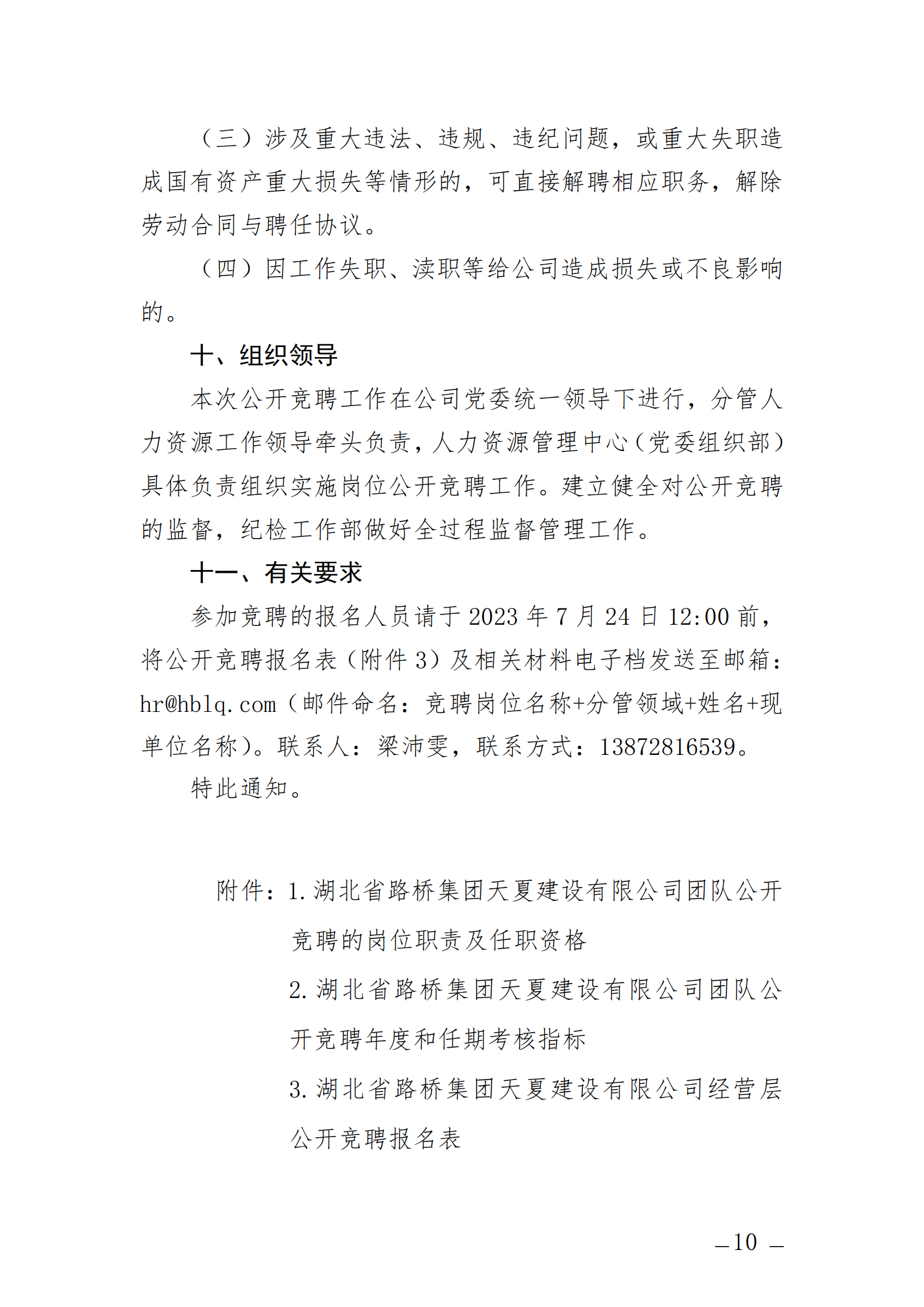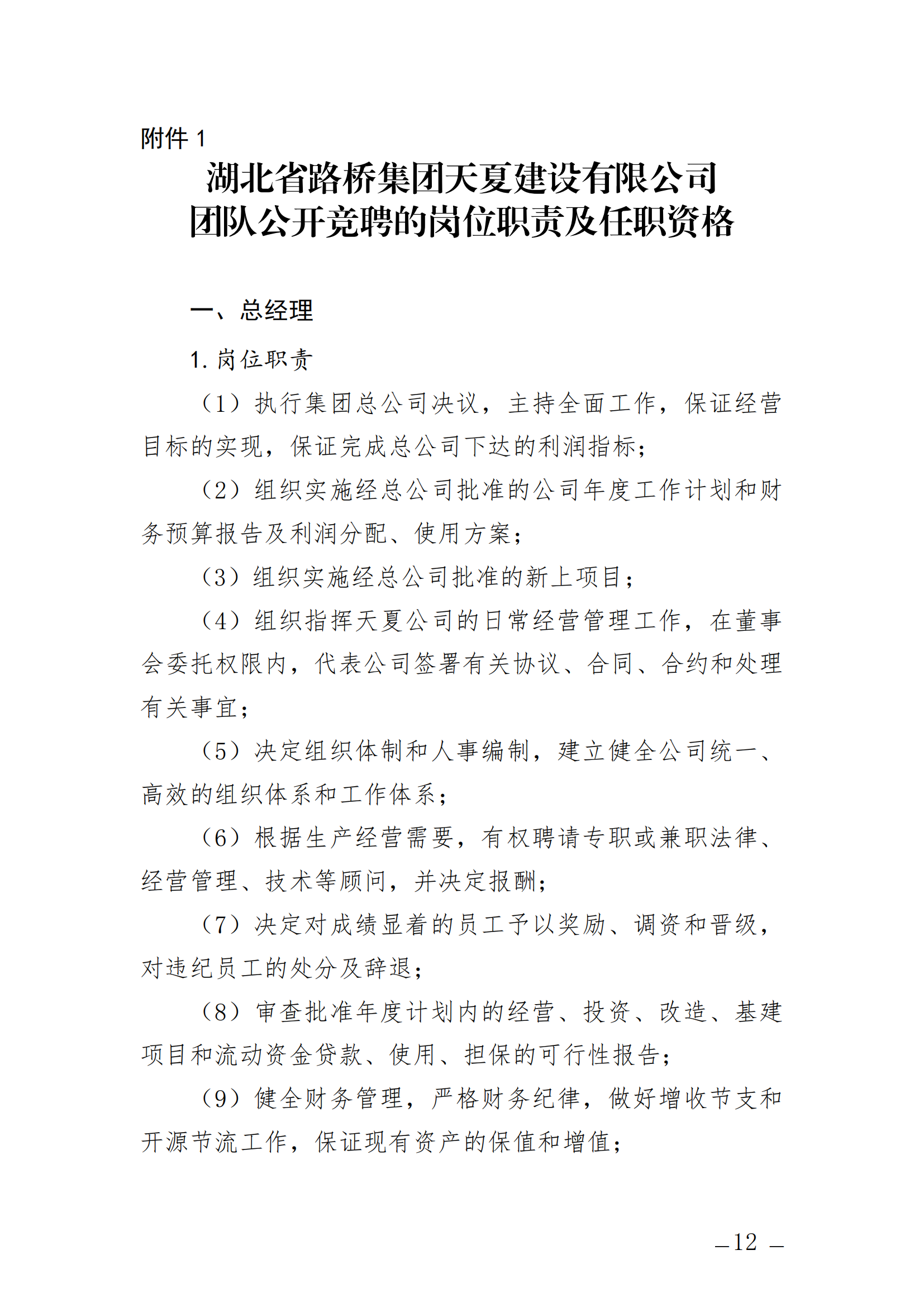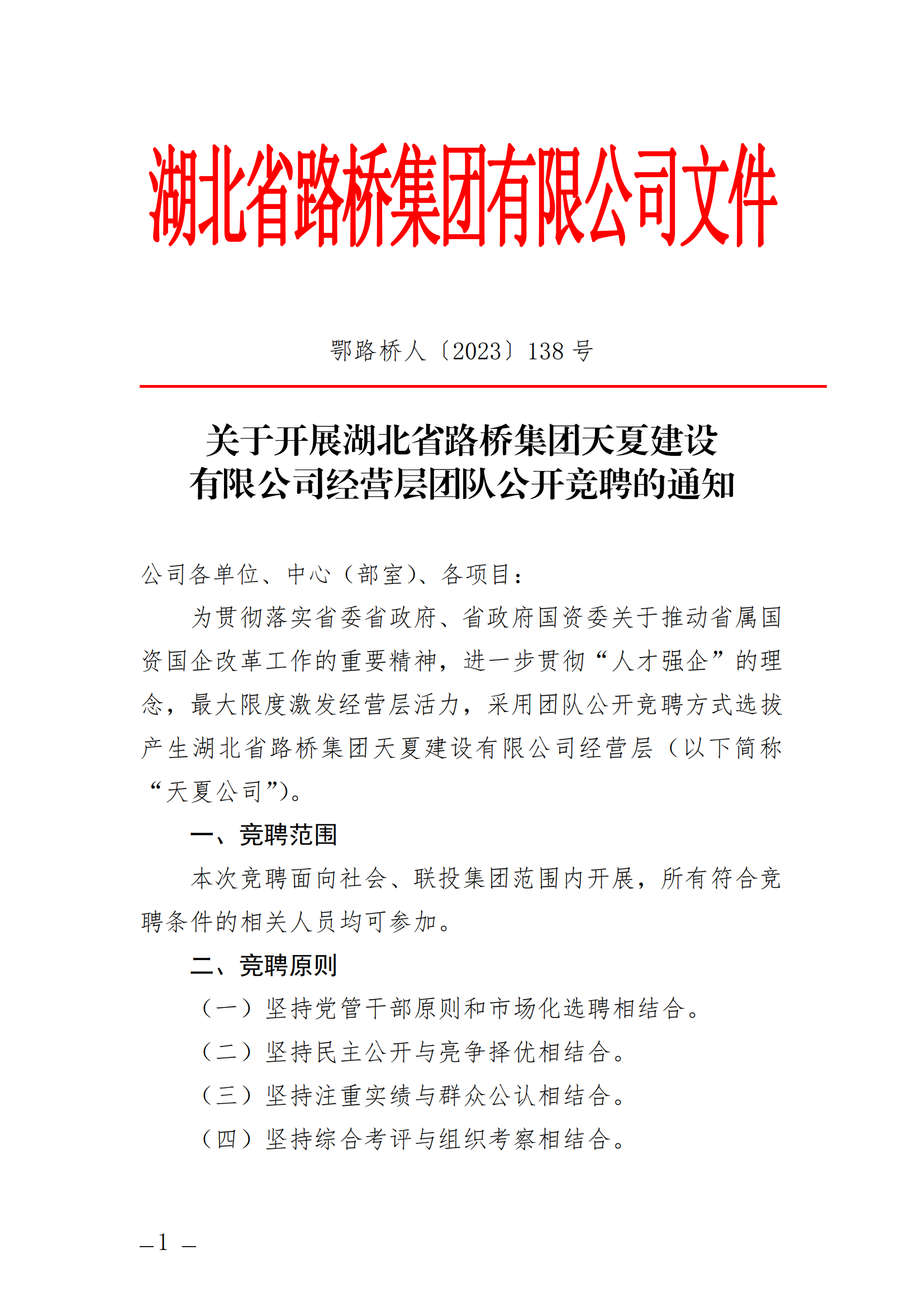關于開展湖北省路橋集團天夏建設有限公司經營層團隊公開競聘的通知