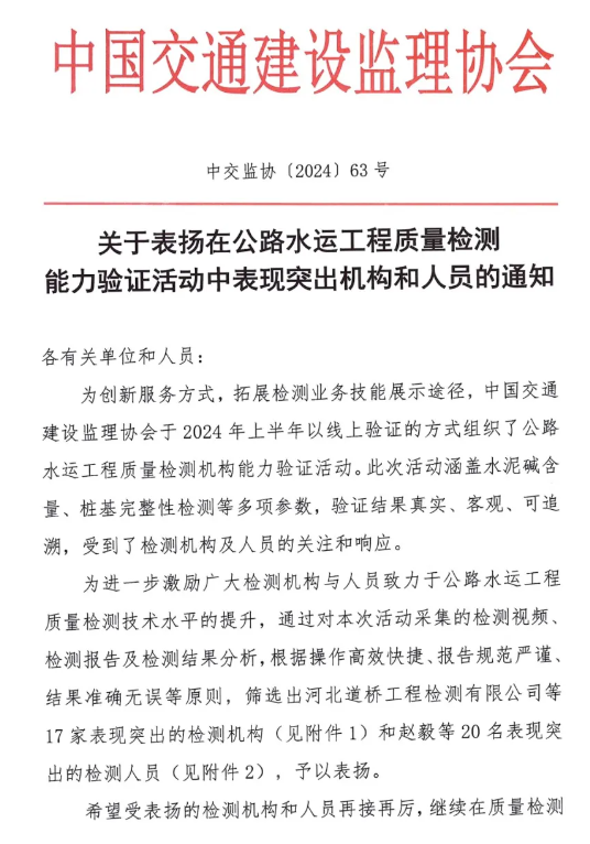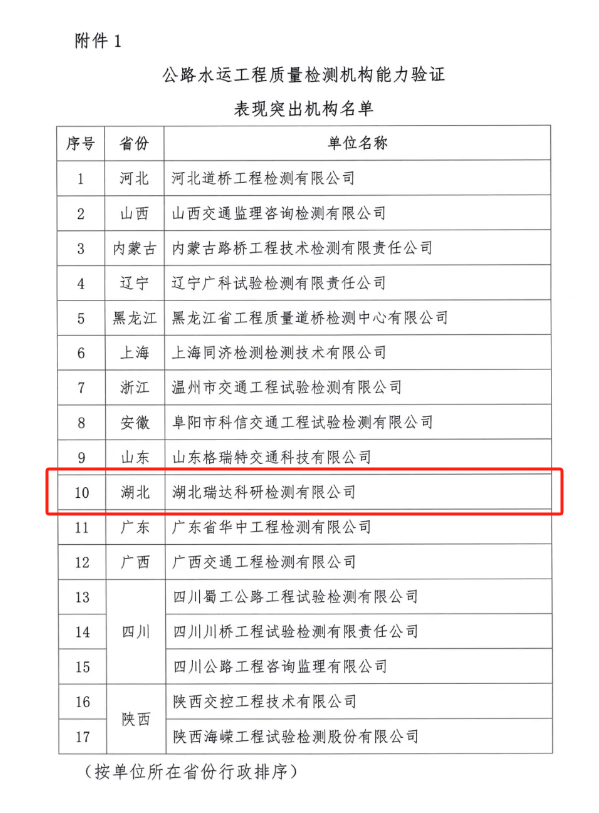 近日,中國(guó)交通建設(shè)監(jiān)理協(xié)會(huì)發(fā)布《關(guān)于表?yè)P(yáng)在公路水運(yùn)工程質(zhì)量檢測(cè)能力驗(yàn)證活動(dòng)中表現(xiàn)突出機(jī)構(gòu)和人員的通知》,湖北路橋旗下的瑞達(dá)檢測(cè)公司榮獲“表現(xiàn)突出機(jī)構(gòu)”稱號(hào),且是湖北省內(nèi)唯一獲得表彰的檢測(cè)單位。