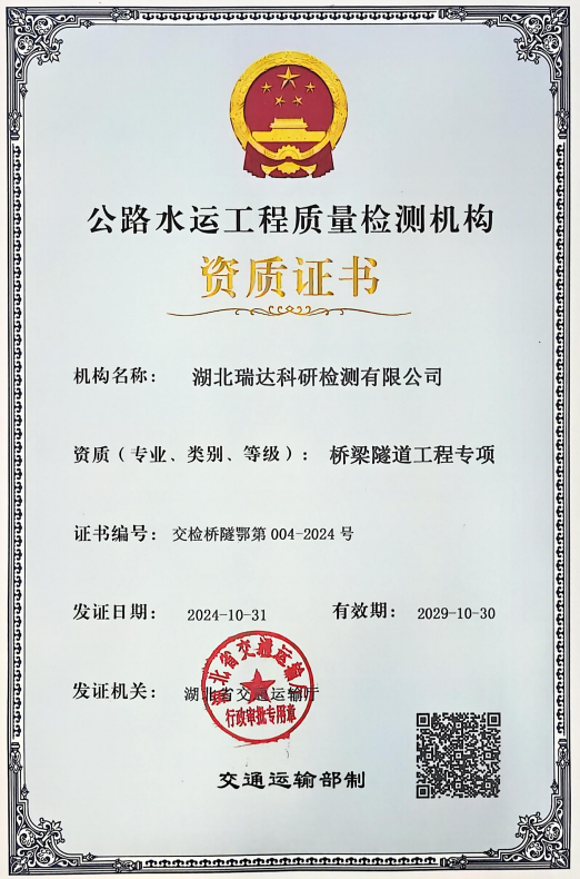 經(jīng)湖北省交通運輸廳批準,湖北路橋瑞達科研檢測公司成功取得公路工程橋梁隧道工程專項資質,成為全省第5家取得該資質的檢測機構,資質實力達到了新高度。