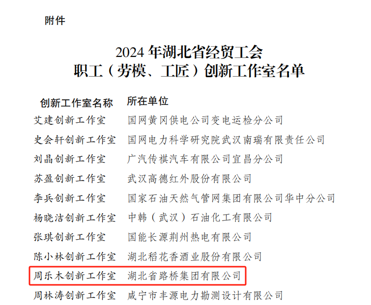 近日,湖北省經(jīng)貿(mào)工會(huì)印發(fā)了《關(guān)于 2024年湖北省經(jīng)貿(mào)工會(huì)職工(勞模、工匠)創(chuàng)新工作室建設(shè)結(jié)果的通報(bào)》,湖北路橋“周樂木創(chuàng)新工作室”獲評(píng)“湖北省經(jīng)貿(mào)工會(huì)職工創(chuàng)新工作室”。