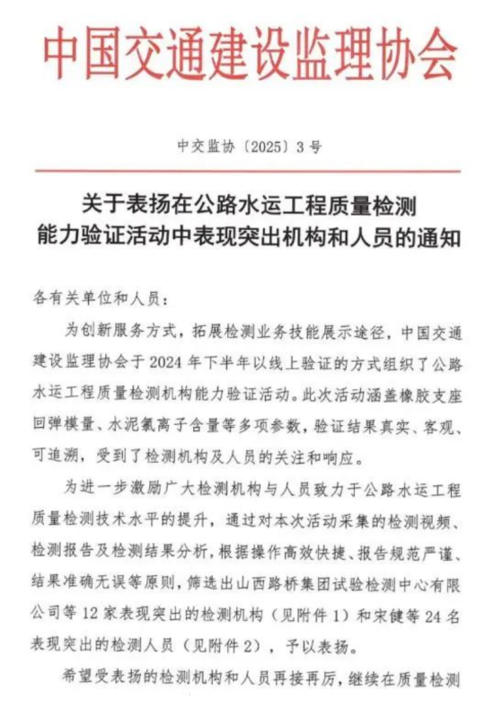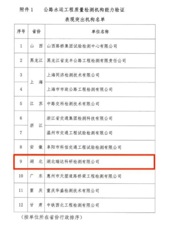 19日,中國交通建設監理協會發布表彰通知,聯投湖北路橋瑞達科研檢測公司成功蟬聯第二屆公路水運工程質量檢測能力驗證“表現突出機構”榮譽。成為全省唯一一家連續兩屆獲此榮譽的檢測機構。