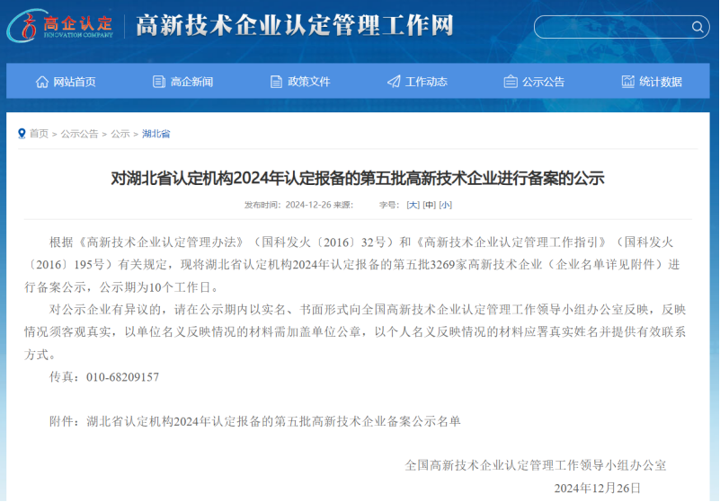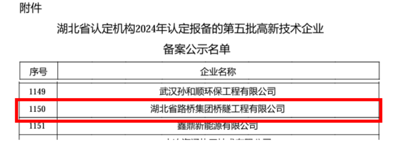 115日,全國高新技術企業認定管理工作領導小組辦公室發布了湖北省2024年第五批國家高新技術企業的備案名單,聯投湖北路橋橋隧公司通過認定,正式邁入國家高新技術企業行列。這標志著橋隧公司在科技創新發展道路上取得新的里程碑,開啟企業發展的新篇章。