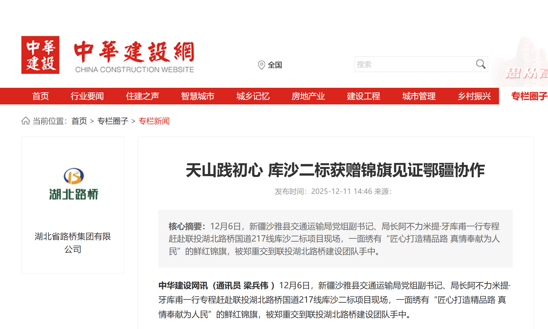 近日,聯(lián)投湖北路橋國道217線庫沙二標項目收到新疆沙雅縣交通運輸局的錦旗,中華建設網(wǎng)、經(jīng)視直播對該事件進行報道,以下是報道全文: