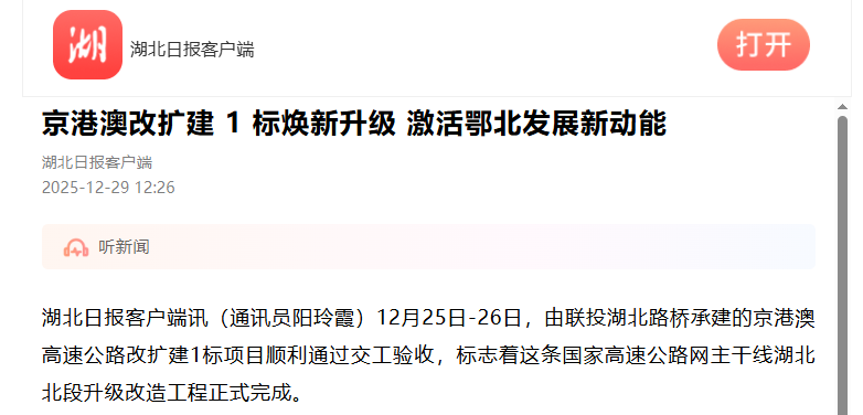 近日,聯(lián)投湖北路橋京港澳高速公路改擴(kuò)建1標(biāo)項(xiàng)目順利通過交工驗(yàn)收,湖北日?qǐng)?bào)對(duì)這一重大節(jié)點(diǎn)進(jìn)行報(bào)道,以下是報(bào)道全文: