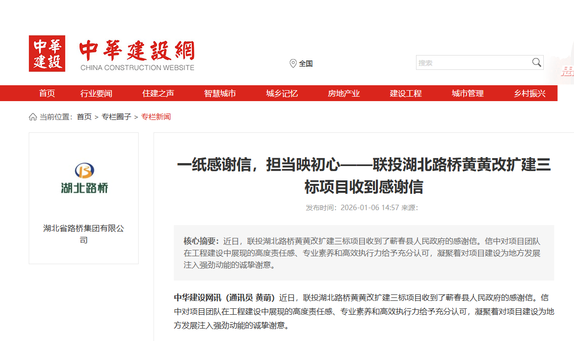 近日,聯(lián)投湖北路橋黃黃改擴(kuò)建三標(biāo)項(xiàng)目收到了蘄春縣人民政府的感謝信,中華建設(shè)網(wǎng)對(duì)此進(jìn)行報(bào)道,以下是報(bào)道全文: