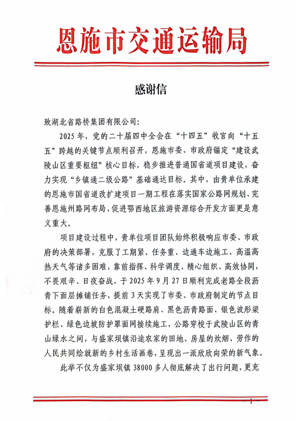 近日,湖北路橋恩施市國省道改擴(kuò)建項(xiàng)目收到來自恩施市交通運(yùn)輸局的感謝信。信中對項(xiàng)目團(tuán)隊(duì)提前、優(yōu)質(zhì)完成關(guān)鍵節(jié)點(diǎn)目標(biāo)表示高度贊揚(yáng)與衷心感謝,充分肯定項(xiàng)目團(tuán)隊(duì)在服務(wù)地方交通建設(shè)、促進(jìn)區(qū)域發(fā)展中所展現(xiàn)的責(zé)任擔(dān)當(dāng)與專業(yè)能力。
