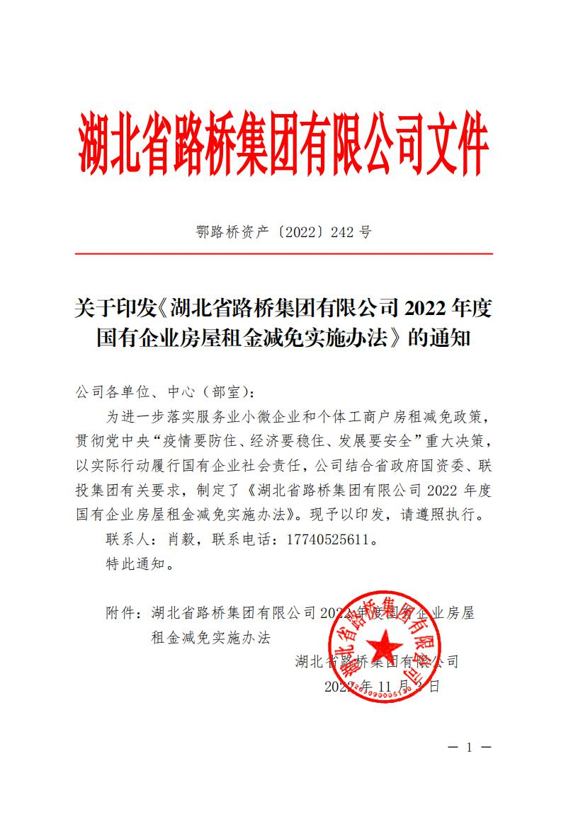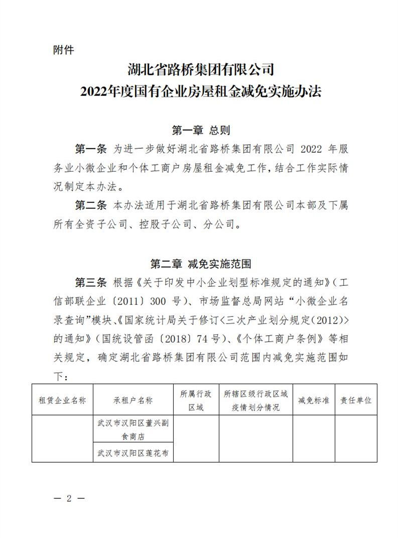 關(guān)于印發(fā)《湖北省路橋集團(tuán)有限公司2022年度國(guó)有企業(yè)房屋租金減免實(shí)施辦法》的通知
